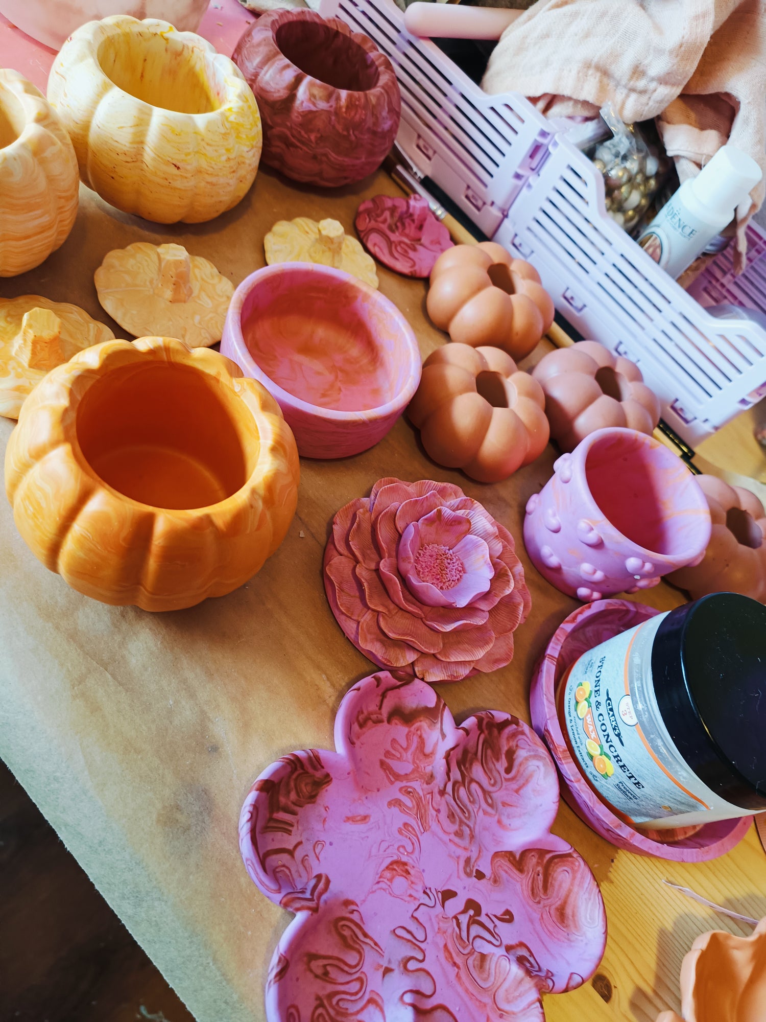 De Jesmonite wordt gegoten in mallen. Nadat het uitgehard is, komt het leukste gedeelte, het 'uitpak feestje'! Je haalt je creatie uit de mal en ziet gelijk wat hoe mooi het geworden is.